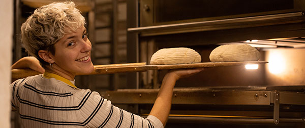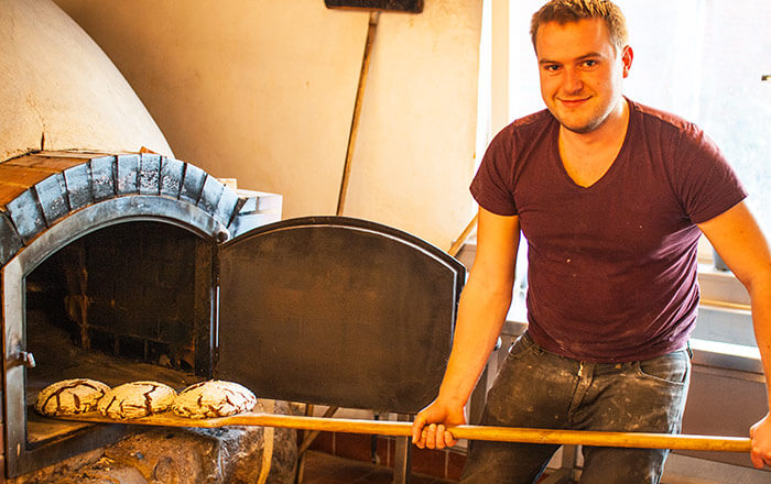 Nun wandert der Teig in seine Form – meist in Gärkörbchen aus Rattan oder in Kastenformen. Die Glut wird anschließend aus dem Ofen geholt. Jetzt ist es an der Zeit, die Brote hineinzuschieben. Je nach Backdauer haben alle ihr bestimmtes Plätzchen. Die Luke sollte man nicht zu oft öffnen, sonst entweicht die Hitze, aber gerade oft genug, dass keines der Brote anbrennt. Es ist also eine wahre Kunst, die unverwechselbaren Michaelshof-Brote auf den Punkt genau zu backen.