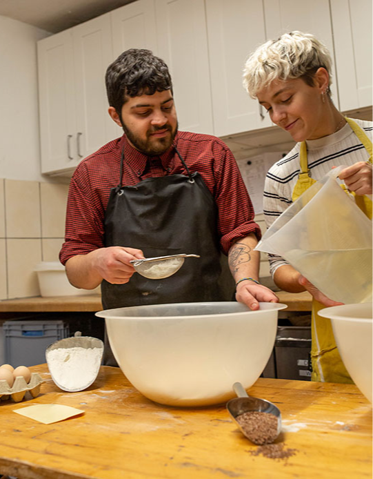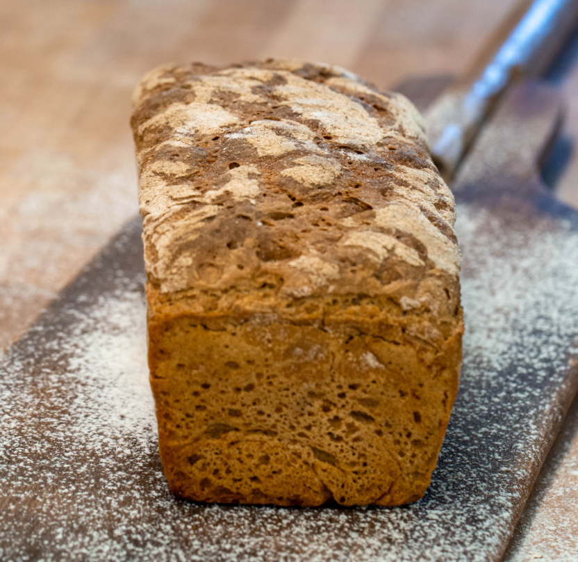 Seit 2022 arbeiten wir an einer Rezeptur für das Honig-Salz-Brot. Kennt ihr nicht? Dann wird es aber mal Zeit! Durch seine besondere Gärung braucht das Honig-Salz-Brot weder Sauerteig noch Hefe, weshalb es sehr schonend und bekömmlich ist. In der Krume (So heißt der gebackene Teig, also das, was sich unter der Kruste befindet) ist es etwas dichter, denn die Nährstoffe sind hier nach langem Kneten und Gären sehr konzentriert. Dafür funktioniert die Verdauung dieses Brotes um so leichter. Besonders praktisch: Honig-Salz-Brot ist bis zu drei Wochen haltbar.