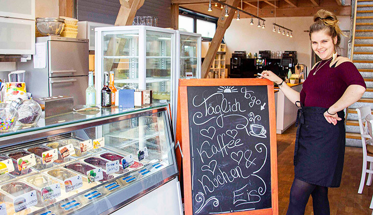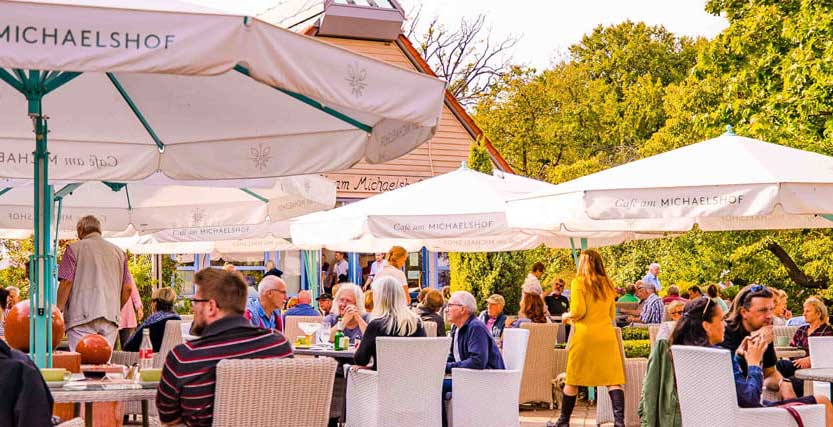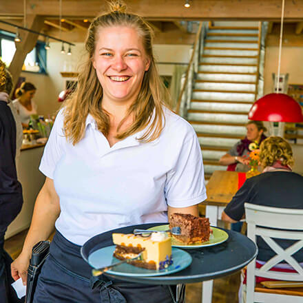 Ein Stück Torte im Schatten der ausladenden Sonnenschirme, eine Stulle im wohltemperierten, gemütlichen Ambiente oder ein Eis für unterwegs: Wie sich in unserem Café das Leben genießen lässt, hat sich längst rumgesprochen. Besucherinnen und Besucher von nah und fern kommen gern auf ein Käffchen und mehr vorbei, und auch unsere Community weiß den liebenswerten Ort zwischen Fachwerkhäusern sehr zu schätzen. Um euer persönliches Wohl kümmert sich ein freundliches Service-Team, das auch bei großem Trubel den Überblick behält. Sonntags wartet unser legendäres Frühstücksbüfett mit Eiern von glücklichen Hühnern und einem Riesenangebot an hofgemachten Leckereien. Einfach reservieren und auf den Sonntag freuen.