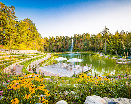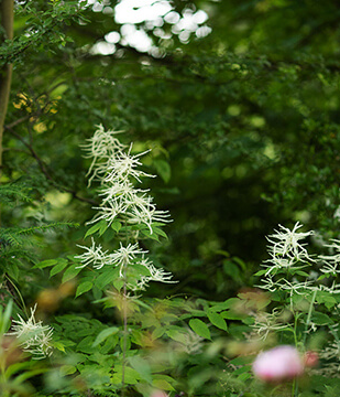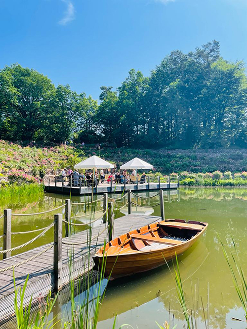Rund um den See laden Bänke zum Verweilen, Schauen und Lauschen ein, denn im Sommer erfüllt im Rahmen abendlicher Konzerte Musik die Luft. Auch im Schatten oberhalb des Sees tummelt sich blühendes Leben. Im Jahr 2018 haben wir nach Anregungen der genialen englischen Gartengestalterin Beth Chatto unter Eichen das Waldgärtlein angelegt, das mit seinen Elfenblumen, Funkien, Silberkerzen und Sterndolden an heißen Sommertagen einen kühlen Rückzugsort bietet.