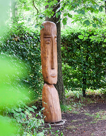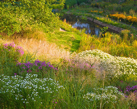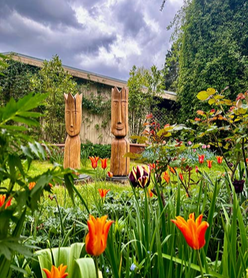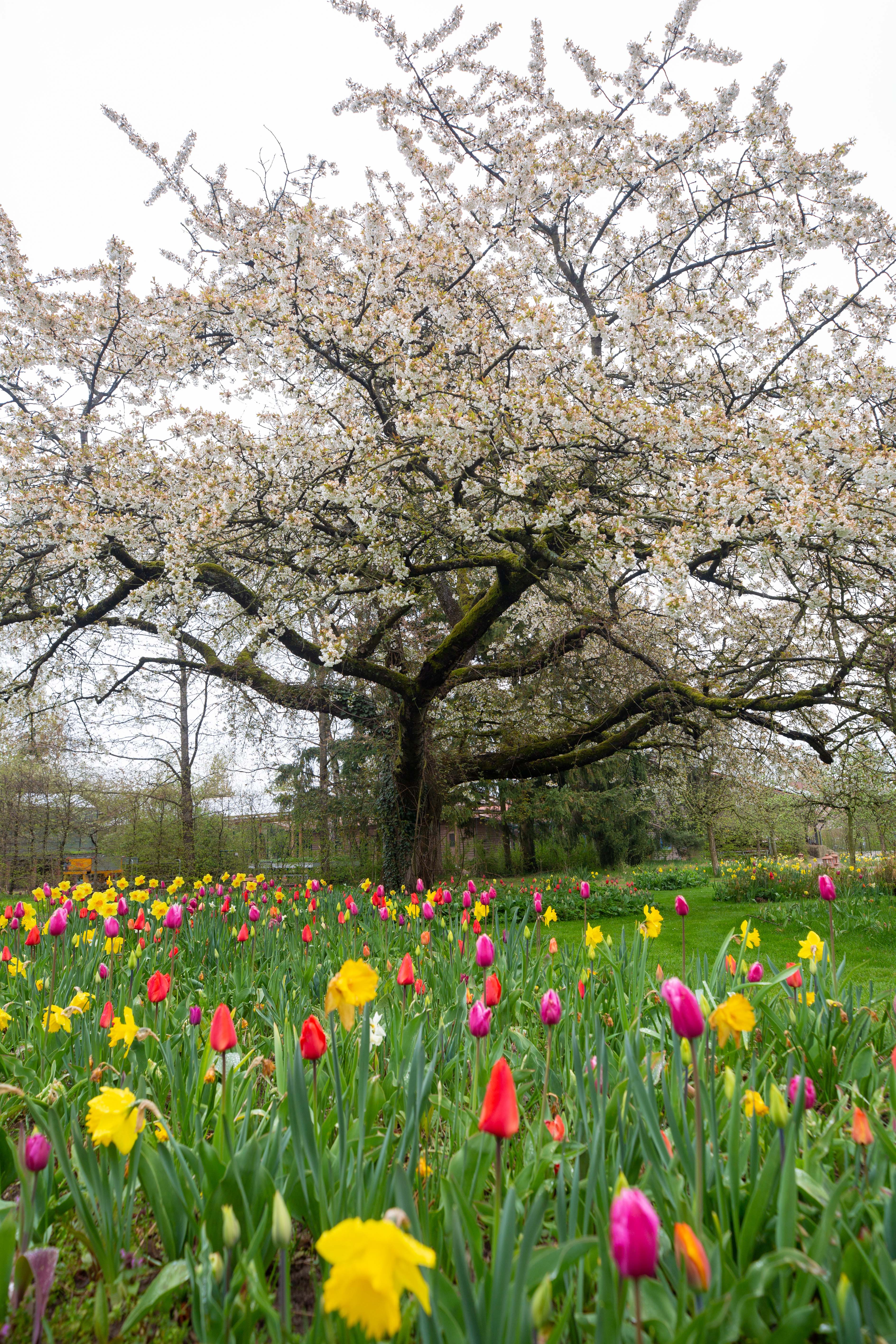 Ein überraschender Ausblick erwartet euch, wenn ihr auf der kleinen Brunnenterrasse am Rande des Kirschgartens steht und weit auf die ‹Arena› genannte Talsenke hinunterblickst. Die von der Eiszeit geprägten Formen sind ein echter Hingucker und werden durch die Gartengestaltung in ihrer Eigenart noch hervorgehoben. Im Frühling ist die Arena ein Frühblüher-Paradies, das gut und gerne mit den großen Tulpen-Pilgerorten mithalten kann, im Sommer und Herbst ein üppiges Blumenreich mit Pfingstrosen, verschiedensten Stauden und großen Sanddornbüschen. Folgt ihr den Serpentinen hinab, laden Bänke am Teich zum Verweilen ein, während – von hohen Gräsern umrahmt – die sieben Freien Künste als menschengroße Holzskulpturen zu bewundern sind.