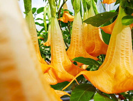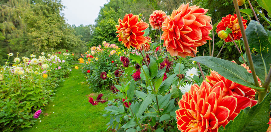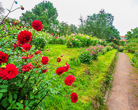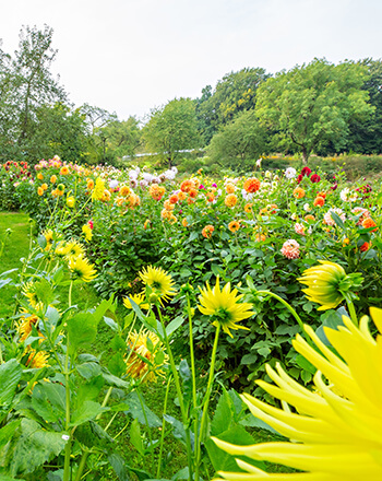 Zwischen dem ‹Michaelshof› und der ‹griechischen Terrasse› lachen euch vom August bis in den Spätherbst rund 80 Dahlien-Sorten in den tollsten Roben an: der tiefrote Samtdress von „Arabic Night“, die weißen Pomponpuschel der Dahlie „Snow White“, eine offene Orange-Gelb-Rote mit Halskrause, „Raisa“ genannt, oder ganz in Signalgelb „Kelvin Floodlight“. Sie recken ihr prachtvolles Haupt der goldenen Herbstsonne entgegen und verschönern mit ihren Farben und Formen die Abschlussvorstellung des Sommers. Mit ihrer Farbenpracht erinnern sie an den Reichtum, der in der Menschenseele liegt, mit dem Wuchern ihres saftig-grünen Krauts sind sie der Inbegriff unbändigen und dennoch geformten Lebens.