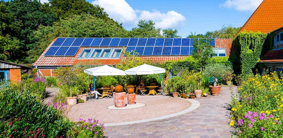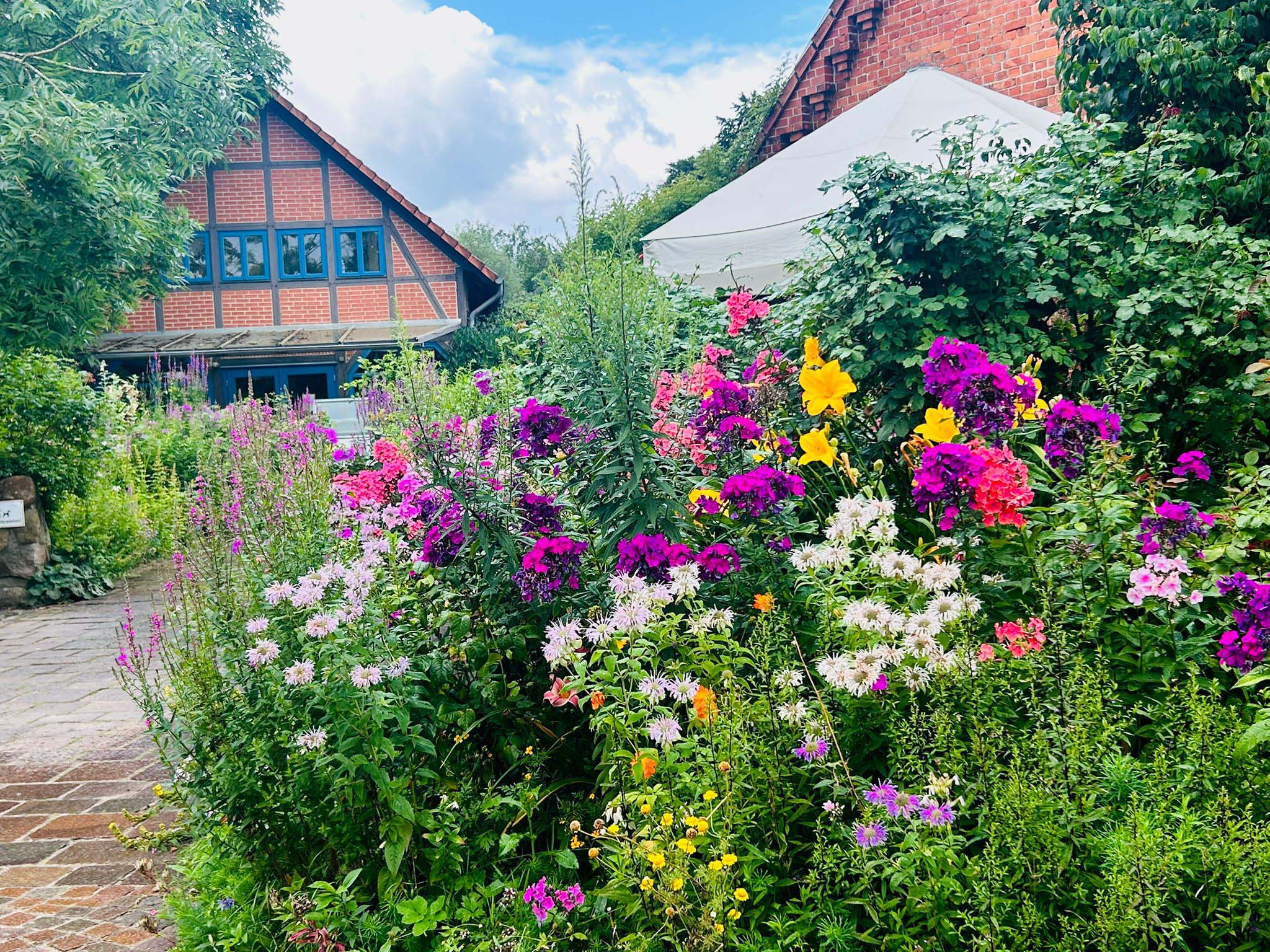 Wie ein hübscher grüner Mantel legen sich die zentralen Gärten um die Gebäude des Michaelshofs. Und wie überall in unserer Community lieben wir es auch bei der Bepflanzung bunt. Rosen, Lilien, Clematis und Hortensien weben unseren Gärten alljährlich ein farbenprächtiges Gewand. Manche Blumen haben nur ein Jahr das Vergnügen bei diesem Farbspektakel mit dabei zu sein, andere bereichern das blühende Ensemble auch in den Folgejahren mit ihrer filigranen Leichtigkeit. Zwischen den Dorfhäusern erwartet euch ein kleiner geschützter Hof, in dessen Mitte ein steinernes Rondell dazu einlädt, auf den Stufen Platz zu nehmen, in die Sonne zu blinzeln und Atem zu schöpfen.