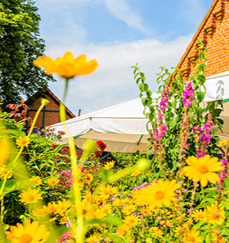 Flankiert von Töpfen mit Zitrusfrüchten und Oliven lässt hier mitten im Wendland das Mittelmeer grüßen. Gleich gegenüber bei der Heilpflanzen-Manufaktur breitet unsere mächtige Eiche ihre knorrigen Arme aus. Vielerlei Rosen blühen ihr zu Füßen. Nur ein paar Schritte und ihr findet euch in den Tropen wieder. Exotische Vögel und Pflanzen bevölkern unser Gewächshaus mit integrierter Voliere. Im feuchtwarmen Klima blüht und sprießt es nicht nur, es wird auch gezetert und krakeelt. Ruhiger wird es dann wieder in unserer Arena, wo im Frühling ein riesiges Aufgebot von Tulpen, Narzissen und Co. zusammen mit blühenden Obstbäumen den Winter vertreibt.