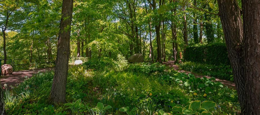 Das Schattengärtchen, hoch über dem Waldsee gelegen, ist ein besonderer Ort, nicht groß und auch nicht offensichtlich spektakulär, aber mit wunderbar ruhiger Wald-Atmosphäre. Farne, Funkien und Elfenblumen überziehen den humosen Boden mit prachtvollem Blattwerk - ein Staudenpuzzle in vielzähligen Grüntönen. Dazwischen blitzen Lichtblicken gleich immer wieder zarte Blüten auf. Über all das wachen die eindrucksvollen Eichenskulpturen von Waltraud Schroll. Folgt dem geschwungenen, schmalen Weg und macht beim großen Findling aus Granit Rast. Von hier aus öffnet sich ein herrlicher Blick auf den Waldsee, dessen Fontäne den Himmel berührt.