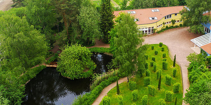 In unserem Campus-Garten treffen sich verschiedene gärtnerische Elemente. Vom Haus der Natur und unserem Youth Hostel auf der einen Seite, von den Stallungen des Archehofs auf der anderen eingerahmt, ist es ein Garten, der zum Spazieren, Ausruhen und Blicke-schweifen-lassen einlädt . Vorbei am Anzuchtgewächshaus und den Heilpflanzenquadern führt euer Weg direkt zu unserer beeindruckenden Kirsche, die im Frühjahr ihre Blütenpracht entfaltet und im Sommer von Rosen umrankt wird. Büsche und Gräser, kunstvoll arrangierte, in Form gebrachte Buchenhecken wie auch der große Teich mit der japanisch anmutenden Holzbrücke machen den Campus-Garten zu jeder Jahreszeit zu einem Ort, der Auge und Herz erfreut.