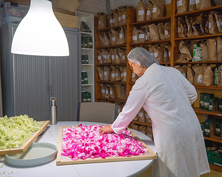 Nur eine Treppe höher wartet ein Paradies für Kräuter- und Heilpflanzenfreunde. Aus den blühenden Preziosen des Michaelshofs entstehen hier mit viele Liebe und Geduld Tees, Gewürzmischungen und Naturkosmetik.