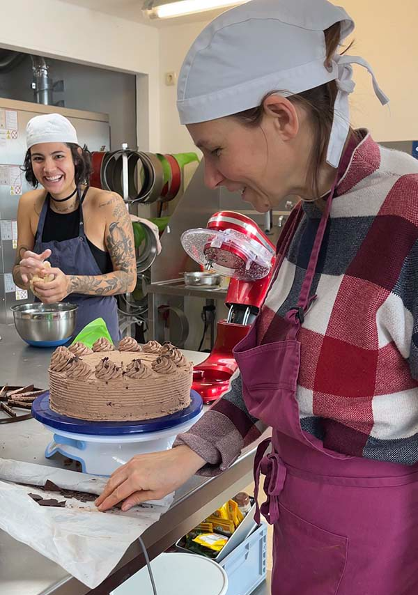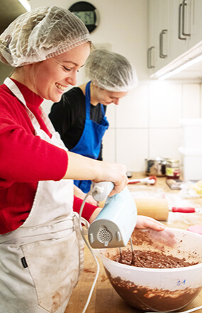 Besonders im Sommer, wenn täglich Gästescharen eintreffen, herrscht in unserer Konditorei Hochbetrieb. In Kombination mit Demeter-Mehl, geschmackvollen Früchten, Bio Backtriebmitteln und Bio Schokolade zaubern unsere Konditorinnen und Konditoren täglich eine riesige Torten- und Kuchenvielfalt. Beigebracht haben sie sich ihr Handwerk selbst, gut beraten von Omas Rezepten, erfahrenen Konditorinnen und dem eigenen Geschmackssinn. Genau deshalb schmeckt bei uns alles hausgemacht − so wie's sein soll.