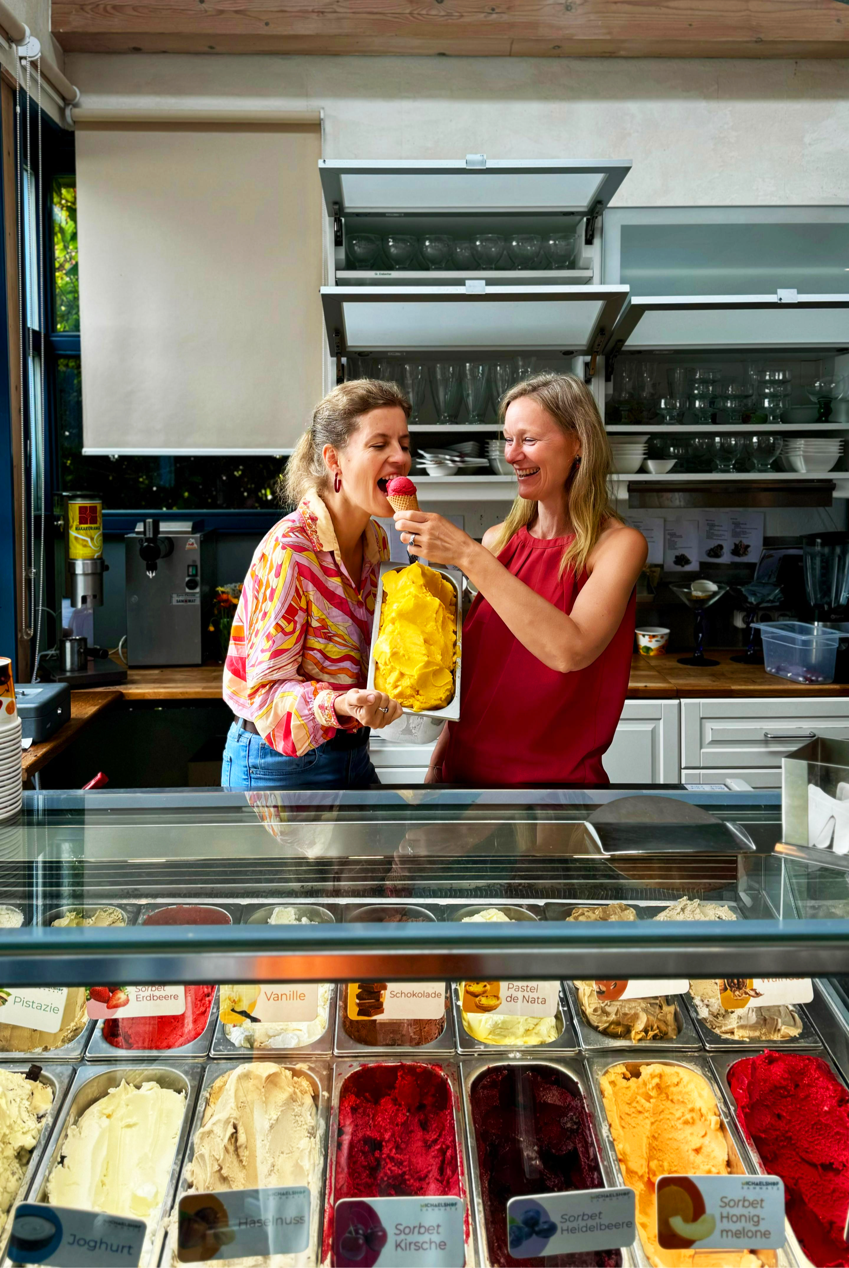 Wow, köstlich! Wie in Italien. Oder sogar noch besser, weil bio? Im Jahr 2024 hielt die erste Eismaschine bei uns Einzug. Ab da waren der Kreativität keine Grenzen mehr gesetzt. In unserer Eis-Manufaktur gehören mittlerweile 23 Sorten zum Repertoire. Sahniges Milchspeiseeis, frische Sorbets und auch vegane Varianten bringen im Sommer die erhoffte Abkühlung. Ein, zwei Bällchen sind euch einfach zu wenig? Verstehen wir. In unserer Eiskarte lachen euch Eisbecher mit Früchten, Schokolade, Nüssen und Karamell an. Auch Sonderwünsche erfüllen wir euch gern.