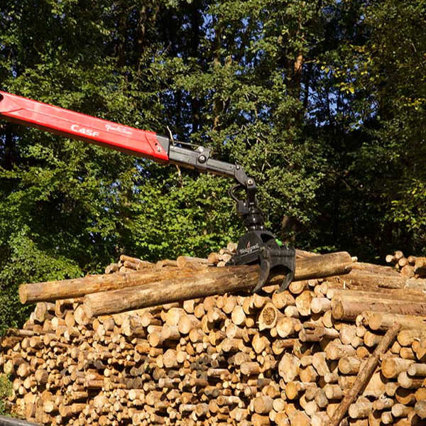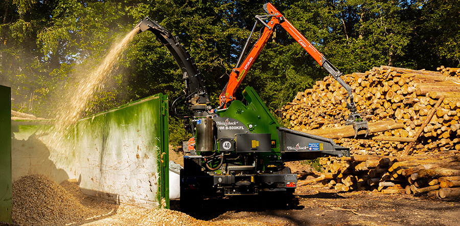 Stammdurchmesser bis 50 cm sind gar kein Problem. Bei dickeren Stämmen besteht die Möglichkeit, sie vorzuspalten. Der Hacker lässt sich mit unserem Kran beschicken. Die fertigen Hackschnitzel wandern direkt vom Hacker in den Anhänger, der bis zu 4 Meter hoch sein kann.