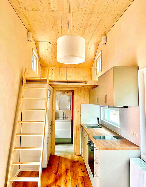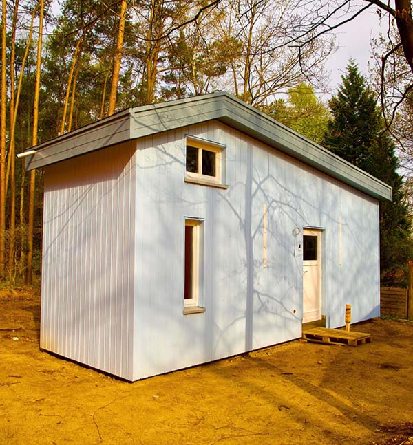 Manche Menschen wohnen gern in einer Gemeinschaft, manche sind Individualisten und sehnen sich nach einem kleinen Refugium. Aus diesem Bedürfnis heraus entstand die Idee, hier in Sammatz Tiny Houses zu bauen. Für dieses Wohnen auf kleinstem Raum gab es bereits einen sehr zufriedenen Vorreiter innerhalb unserer Community. Da die Nachfrage recht groß war, machten wir uns schnurstracks daran, einen Prototypen aus Fertigteilen zu entwickeln, der sich leicht aufbauen, bei Bedarf an einen anderen Ort versetzen und auch wieder rückbauen lässt.