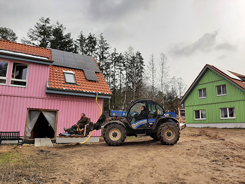 Eine Gemeinschaft, die solchen Zuspruch erfährt wie wir, muss sich natürlich um Wohnraum für alle Mitglieder kümmern. Unterhalb des alten Dorfes hat nun eine kleine Siedlung aus Holzhäusern ihren Platz gefunden, deren bunte Fassaden ein Abbild unserer sehr vielfältigen Community sind: die Flachsenberg-Siedlung. Da unsere Community stets in Bewegung ist, sind Umbauen, Anbauen, Neu-Bauen bei uns allgegenwärtige Themen. Zu unserer Gemeinschaft zählt daher auch ein findiger, sehr geschickter Bautrupp, der die vielen fleißigen Helfer anleitet. Die Siedlung ist natürlich an unser eigenes Nahwärmenetz angeschlossen, das zum einen durch ein Blockheizkraftwerk auf Holzgasbasis, zum anderen durch eine Hackschnitzelheizung gespeist wird.