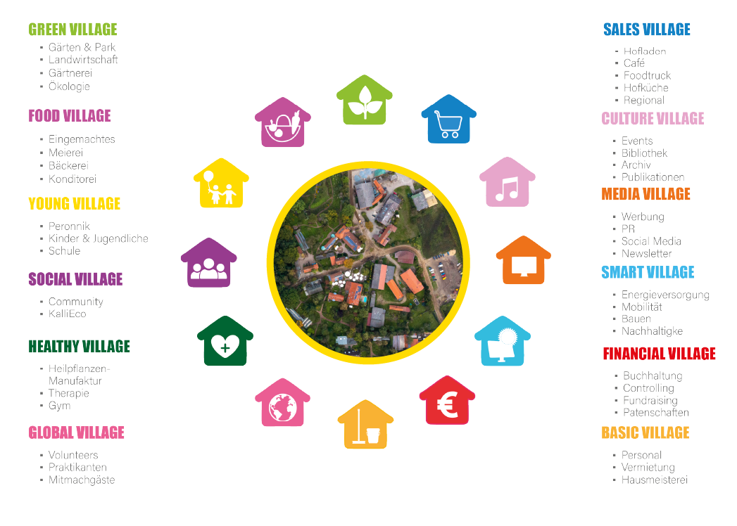 Unsere Gemeinschaft wächst und wir mit unseren Aufgaben. Angesichts der Dynamik am Michaelshof immer den Überblick zu behalten, ist gar nicht so leicht. Dank eines engagierten Teams aus alten, erfahrenen Hasen und jungen, tatkräftigen Newcomern haben wir jedoch alles im Griff und unseren Hof sowohl in Arbeitsbereiche als auch in verschiedene Rechtsformen gegliedert. Da wir alle Menschen mit unterschiedlichen und auch sich verändernden Interessen sind, kommt es vor, dass sich Zuständigkeiten im Laufe der Zeit verschieben. Das gehört bei uns einfach dazu und bringt unsere Gemeinschaft voran. Derzeit besteht der Michaelshof aus zwölf Villages, die sich unterschiedlichen Aufgaben widmen. Es kann aber durchaus sein, dass es noch mehr werden - je nachdem welche Impulse noch kommen werden und wie wir sie in unser Dorfleben integrieren. Wir dürfen also alle gespannt sein.
