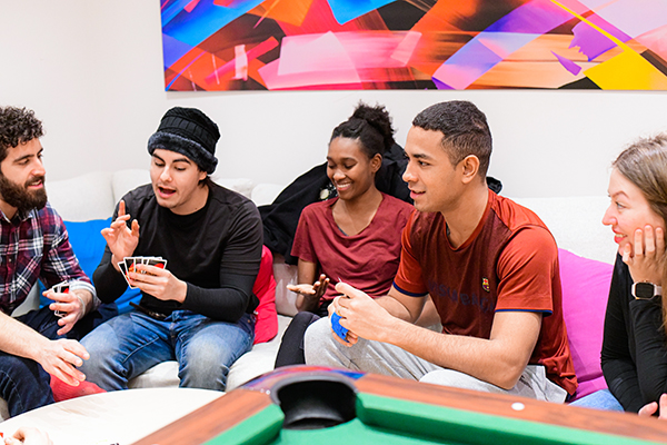 Im Erdgeschoss ist Platz für alles, was zusammen großen Spaß macht: internationale Kochabende, Singen, Musikmachen, Spielerunden. Ihr braucht mal ein bisschen Raum für euch? Den kriegt ihr in unserer Little Lounge. Pst, hier herrscht Ruhe – zum Relaxen, Filme-schauen, Lesen und Gedanken schweifen lassen.