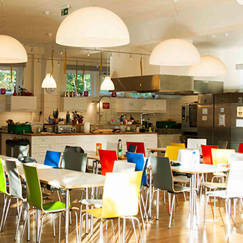 Ihr wohnt in Mehrbettzimmern. Bei längerem Aufenthalt ist es je nach Verfügbarkeit möglich, in ein Ein- oder Zweibettzimmer zu wechseln. In unserem großzügigen Gästehaus – im Blauen Haus − findet ihr große Gemeinschaftsräume und eine tolle Küche. Und in den Gärten gibt es noch viel mehr Platz, wenn ihr mal eure Ruhe braucht.
